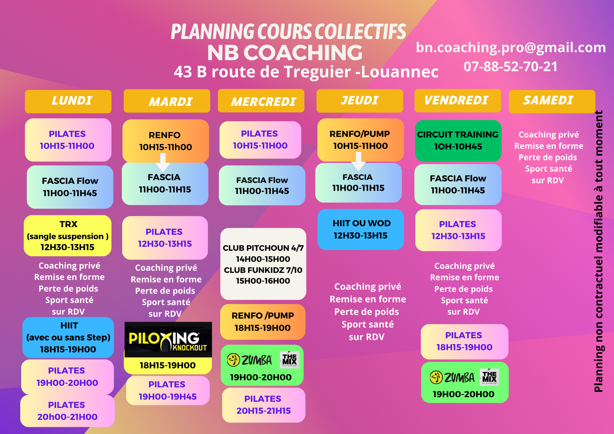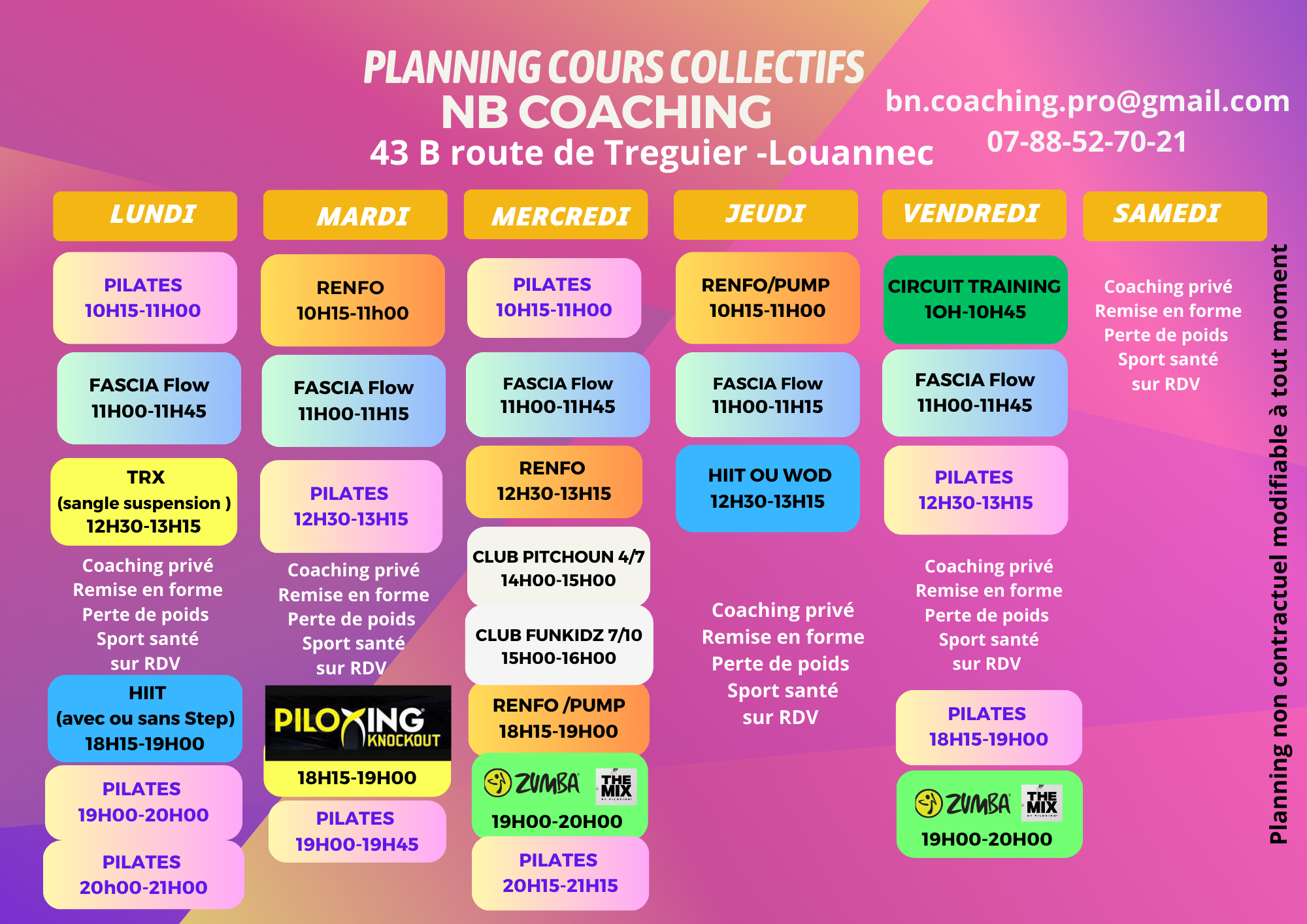 Découvrez le programme des cours collectifs proposés par NB Coaching.